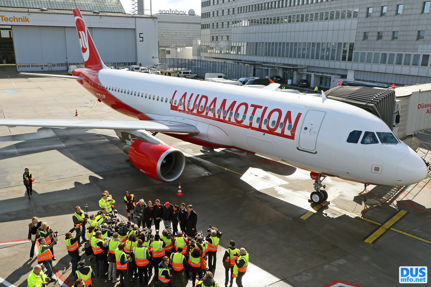 «1st visit of Laudamotion @DUS with the late owner and Formula 1 icon Niki Lauda onboard, unmistakenly wearing his red cap, he and the crew are posing for the crowd of journalists»