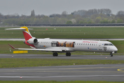 () «Since 2022, this Bombardier Canadair Regional Jet has carried advertising for the Rioja wine region and the slogan Lo Mejor Esta Por Venir - The best is yet to come. Seen here on the Iberia schedule to Madrid on April 4»
