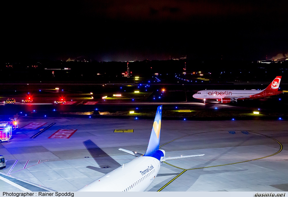 «27.10.2017: Sad and very historic moment: Air Berlins very last scheduled movement @ DUS ever guided by three marshaller to final stand at 11:33 p.m.. It was flight AB8719 from FCO.»