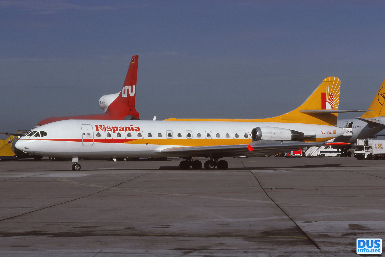 «In Hispanias new color scheme, which was introduced in the summer of 1985, EC-CIZ, operated by LTU with registration D-ANYL from 1969 to 1974, rolls to its parking position at terminal C»